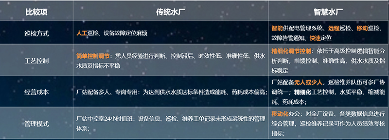 企业生产运维成本的降低,设备系统可靠性的提高,节能降耗,降低水厂运营人工成本,最重要的是智能水厂提高了企业管理层级和管理能力