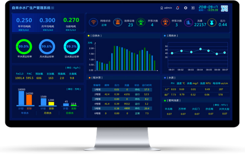 从现场自动化控制、工艺智能化运行、生产过程实时监控、设备巡检及运维管理、生产运行指数分析、数据报表分析、安全生产管理、故障预警分析、移动智能服务的角度打造管控一体化的生产运营管理平台,在高效的人机交互模式下减少对自来水厂内人力资源的要求,实现了厂级少/无人化管理。